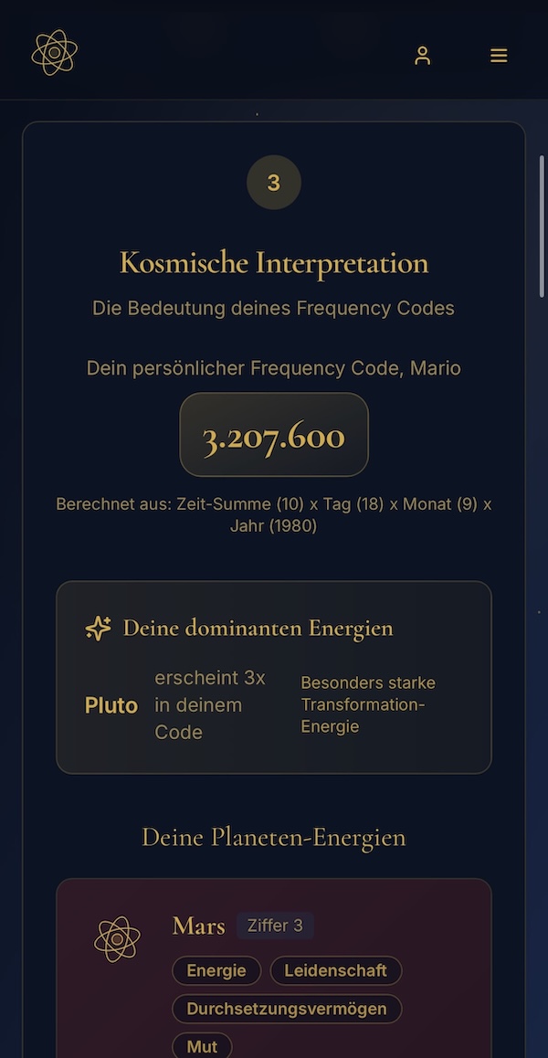 PLANET-BIRTH FREQUENCY CODE® ist ein personalisiertes Selbstreflexions-Tool, das aus deinen Geburtsdaten einen individuellen „Frequency Code“ berechnet – gedacht als kosmischer Fingerabdruck.